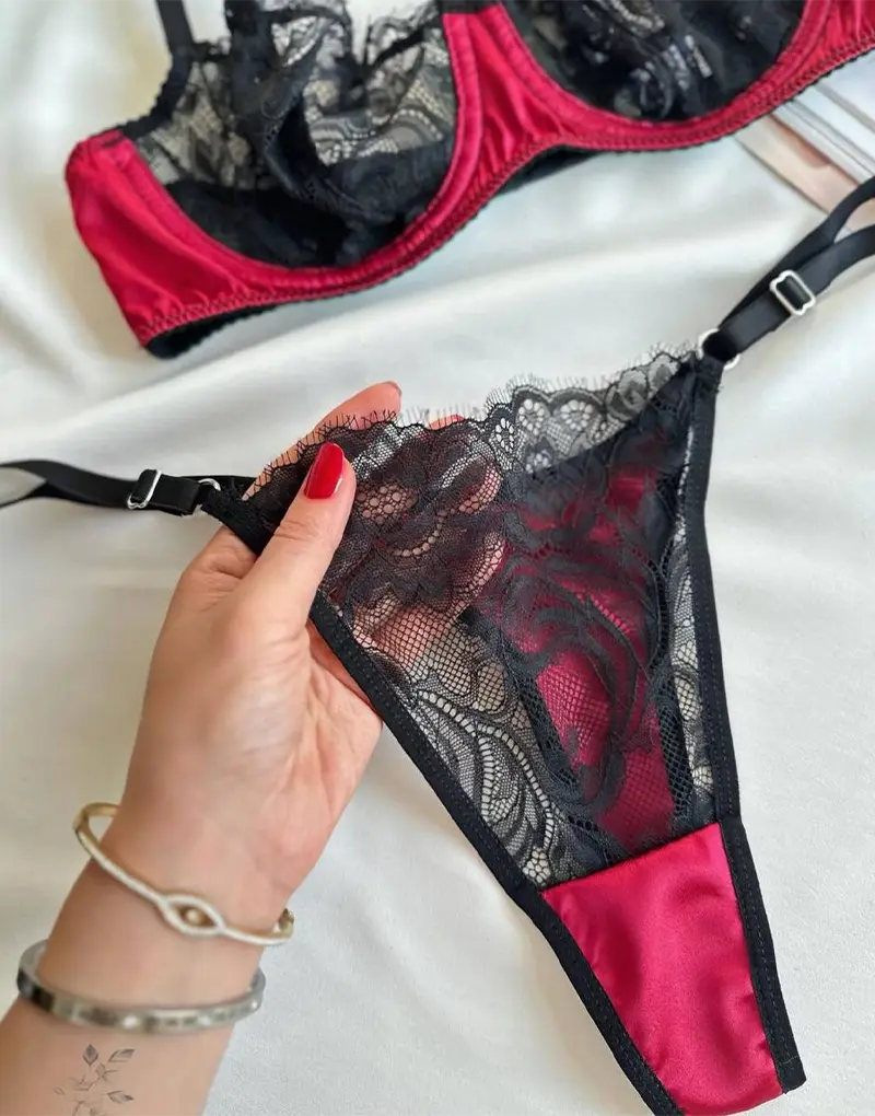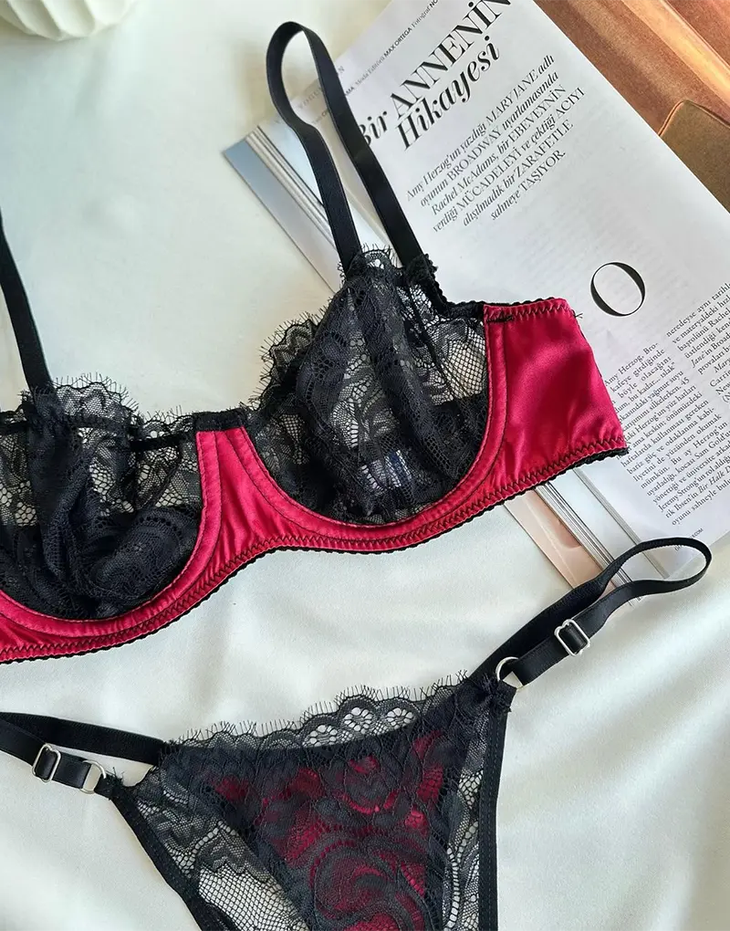 Siyah satenin ipeksi dokusu ve kırmızı dantelin cazibesiyle tasarlanan özel gecelik takımı koleksiyonu.