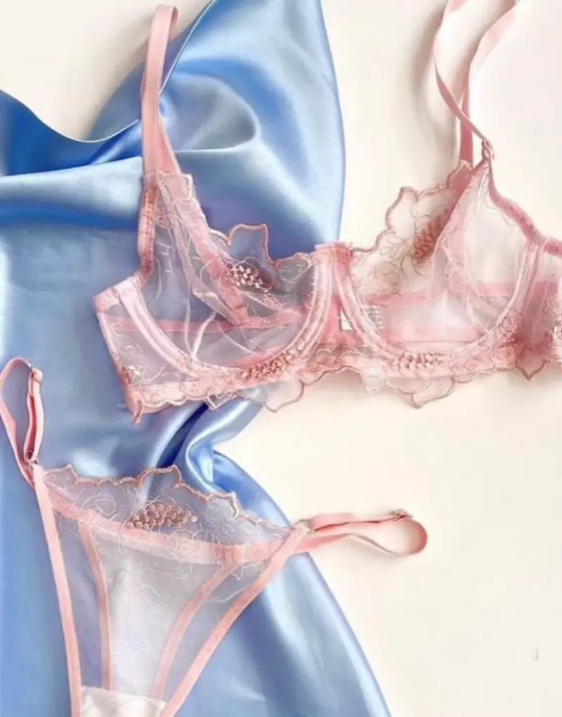 Pudra Pembe Çiçek İşlemeli Transparan Tül Balenli Sütyen Takımı